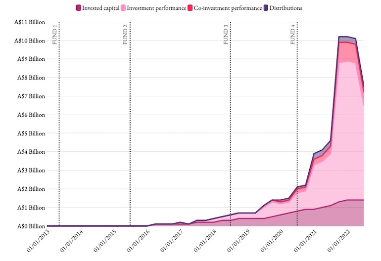 In aggregate, a dollar invested in all of our funds has earned an IRR of 56% and more importantly for us a net multiple of invested capital (TVPI) of 4.4x. It’s not time to pat ourselves on the back – the vast majority of this is still unrealised, so it’s a progress mark at this point in time rather than the end result for our funds. Given the growth forecasts of our top companies we don’t have to look too far into the future to see that total valuation climbing back above the $10B mark and beyond.