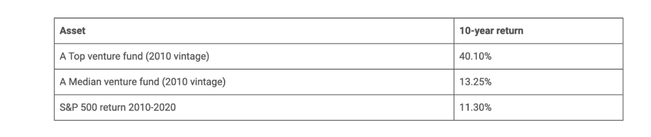 Look at the top performing venture fund in our table above – coming in at 40.10% annual return which is almost 4x what you could have made in the S&P 500. This is what we call outsized returns. The median venture fund on the other hand didn’t do that much better than the S&P 500. After accounting for increased risk and illiquidity (an LPs money is locked up for 10 years in a VC fund), you likely would have been better off investing in the S&P 500 vs. the median venture fund.
