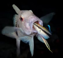 A bluestreak cleaner wrasse at work cleaning the mouth of a goatfish. Wayne and Pam Osborn/iNaturalist, CC BY-NC