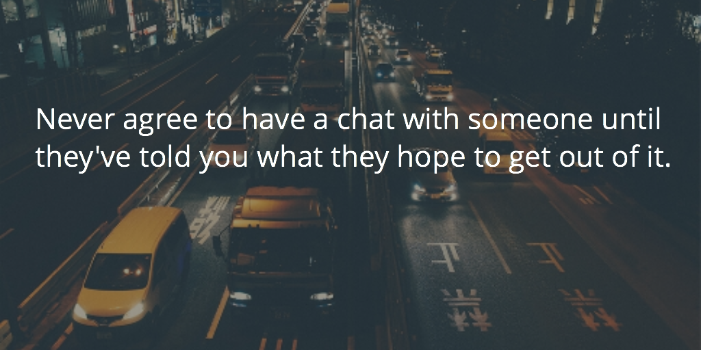 It’s probably not the One True Rule Of Success but it’s got to be in the Top 10: never agree to have a chat with someone you don’t know until they’ve told you what they hope to get out of it.