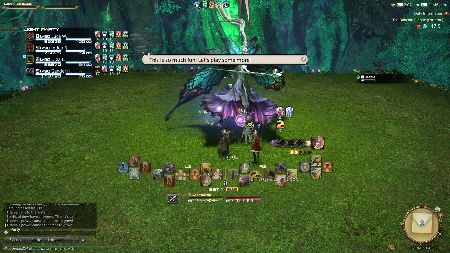 By itself, Final Fantasy XIV is an decent time sink. But the true joy of the game is playing with others — preferably those you know — mucking around in boss fights and dungeons. I logged in on Tuesday night with three friends and immediately remembered why I had spent over 1,000 hours in this game — mainly during the pandemic. My friends and I try to break the game by beating bosses on a higher character level, but with fewer players than is typically required for the fight.