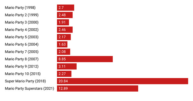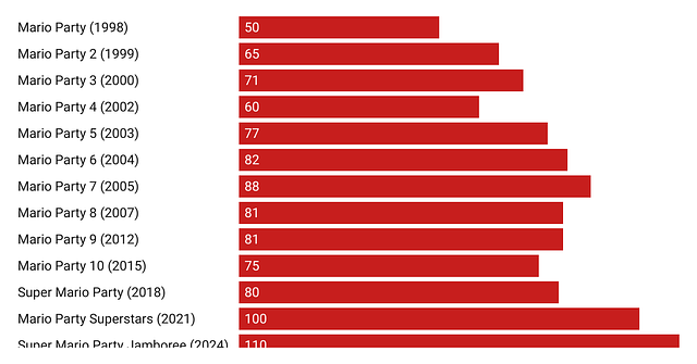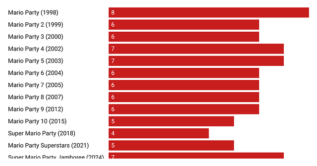 With Super Mario Party Jamboree — the 19th game in the series — out late last week, I wanted to delve into what makes this really unique form of game tick and map (with data) how it’s played out over the years.