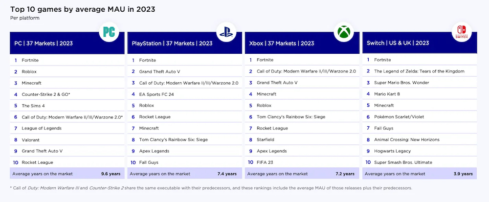 That’s right: Fortnite, Grand Theft Auto 5, Call of Duty and Minecraft beat out major hits like Diablo 4, Bauder’s Gate 3 and Legend of Zelda Tears of the Kingdom in terms the time gamers spent playing on them last year.