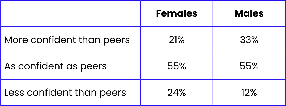 It turns out that only 12 per cent of males rate themselves as less confident than their peers. For females? It doubles to 24 per cent.