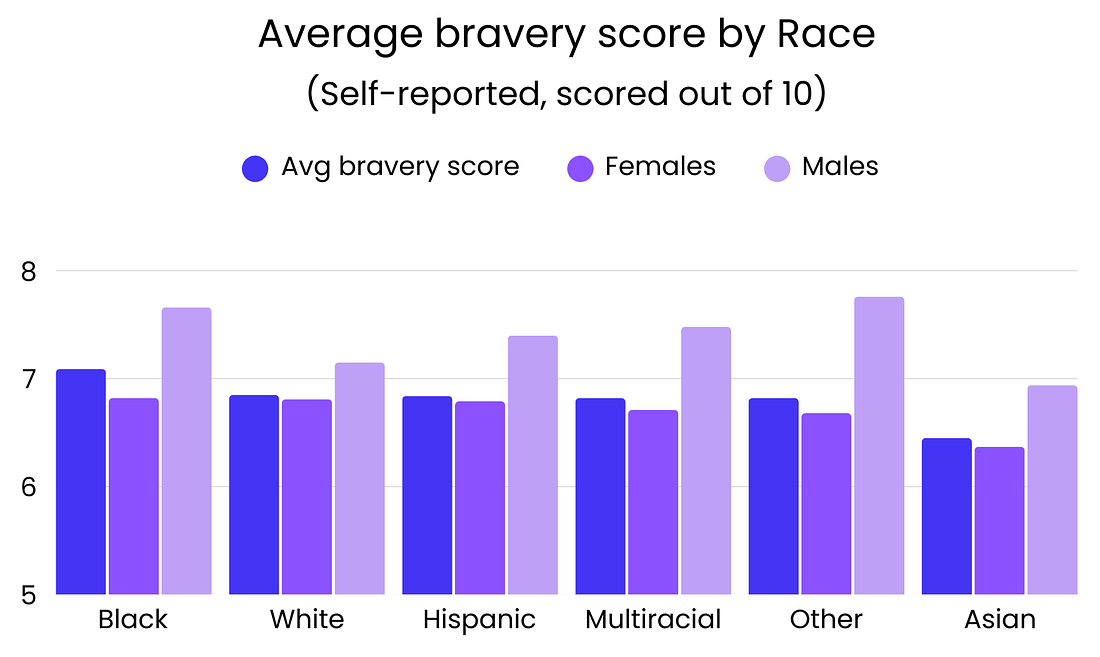 Black individuals are, on average, the bravest cohort. Asian individuals tend to feel the least brave.