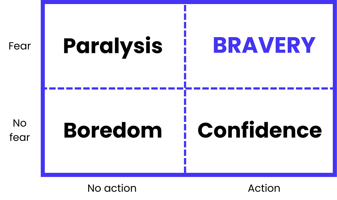 Outside of physical bravery, it’s a word that’s fallen out of fashion. Rarely do we say ‘I wish I was braver’ or ‘I want more courage’. Instead we all ask for more confidence (more on this in part 2). Perhaps because to be brave, you have to admit to fear. And admitting you have fear is almost shameful.