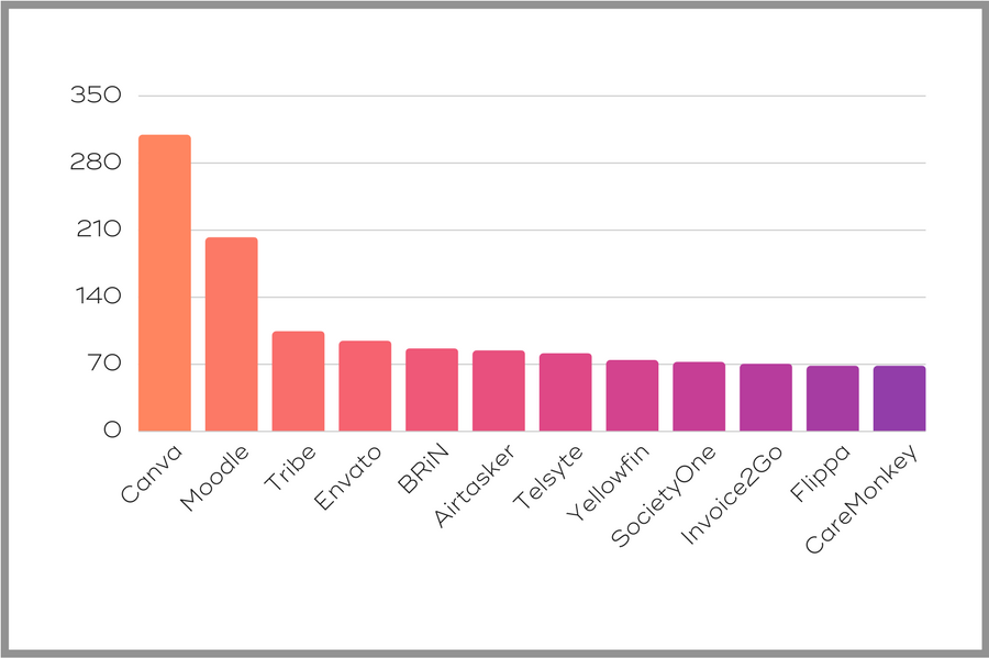 It is no surprise that Canva is number one. The company started building strong personal relationships with key people in the media well before it launched its platform and always presents the media with press opportunities that can be approached from multiple angles and translate well to a variety of demographics. Coming in second is Learning Management System (LMS) Moodle.