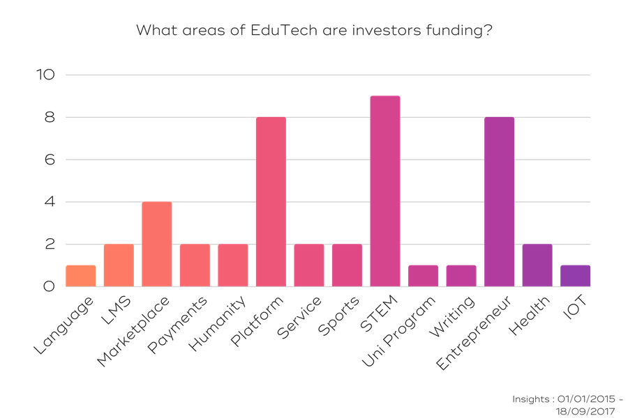 Overwhelmingly investors have been most active in supporting EduTech companies that focus on STEM (20%), Entrepreneur Education (18%) and B2B platforms (18%) that allow companies to create their own educational offerings such as courses or internal training etc.