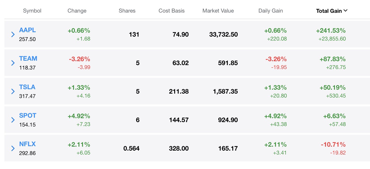 He started with Apple shares at US$74.90 nine years ago, now worth $257.50, nabbed Tesla stock in 2015 at US$202.49, now sitting around $317.47 and last year got into Atlassian at $63.02, now $118.37. His only investment bound for the knackers is Netflix at $328, which now sits at $292.86.