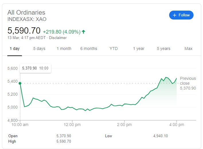 But then the ASX had this sort of Stephen Bradbury moment, staging a late rally for the All Ordinaries to end the day just over 4% up (the ASX200 +4.4%). It was enough sunshine to have some pondering whether the worst if over. Let’s see how next week pans out.