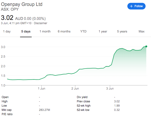 Openpay sat at $1.30 on Monday morning, gained 26% that day following the announcement, climbed to $1.99 by Tuesday evening and today exploded, finishing the day also at a record high of $3.02, up more than 51%. On Thursday morning, the company suspended trade pending an announcement on a capital raise.