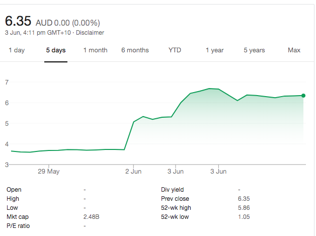 Zip shares just nearly 40% on Tuesday on news that that it was buying US BNPL QuadPay in an equity swap worth around $400 million. Read all about that here. The shares jumped a further 22% on Wednesday to new record highs, at one stage climbing above $6.50, to end the day at $6.35.
