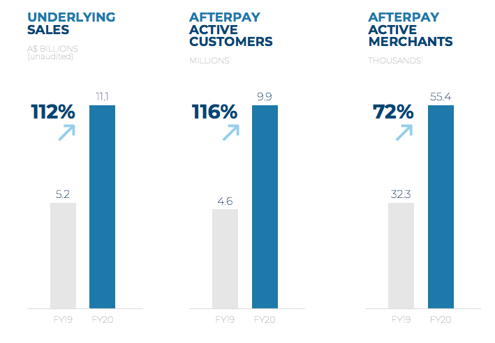 Afterpay growth FY19-FY20. Source: Afterpay investor presentation
