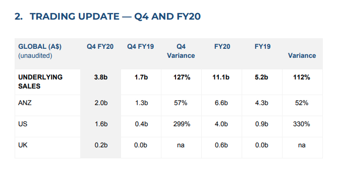 Afterpay said regions performed well in Q4 FY20 with sales in the UK 62% higher, US 62% higher and ANZ 38% higher than Q3 FY20. Contribution of underlying sales from the developing US and UK markets increased to 47% in Q4 FY20 , up 4% on the previous quarter.