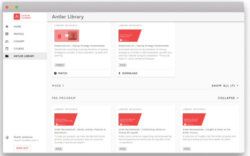The Antler Launch Academy team poses weekly challenges, offers feedback through office hours, facilitates the connection with others in the cohort and shares an array of resources via their online platform.