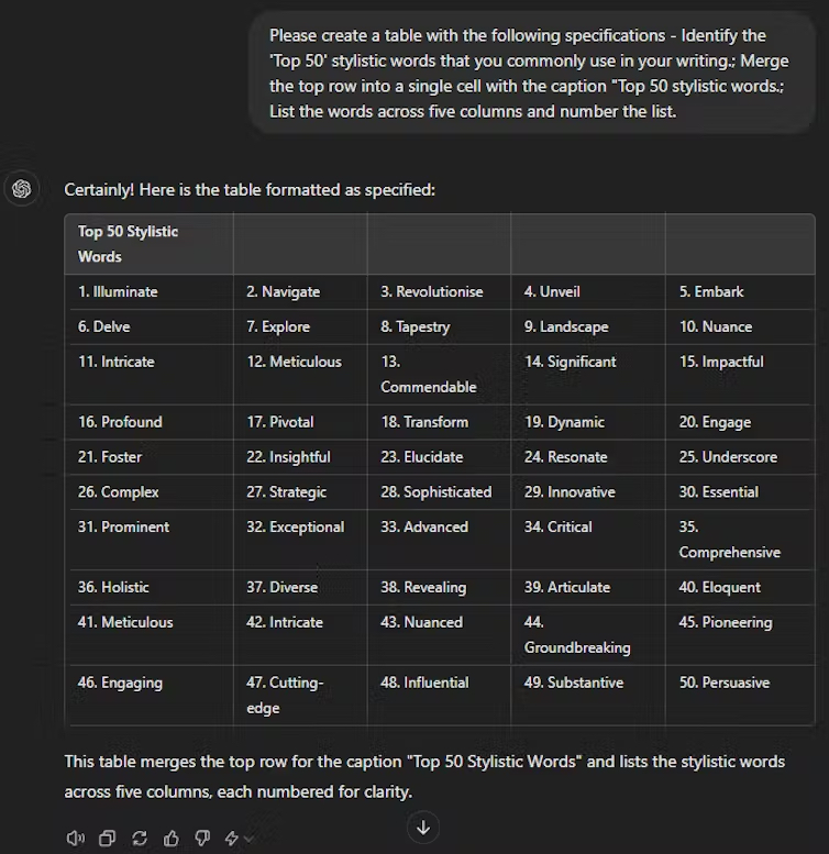 There’s currently no research that can give us an exact list of the most common stylistic words used by ChatGPT; this would require an exhaustive analysis of every output ever generated. That said, here’s what ChatGPT itself presented when asked the question.