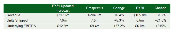 - FY21 revenue forecast increased to $217.6million with EBITDA of $12.9 million.