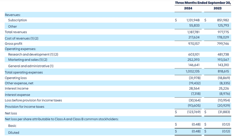 But alongside the growth story, Atlassian continues its long-standing tradition of losses, which have jumped year-on-year. The net loss for the September quarter was US$123.8 million, around 300% higher than the $31.9m net loss for Q1, FY24. The net loss per diluted share rose to $0.48 in Q1 FY25, from -$0.12 in the corresponding quarter 12 months ago.