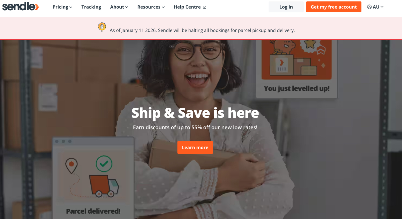 The top of the company’s site says “As of January 11 2026, Sendle will be halting all bookings for parcel pickup and delivery.”