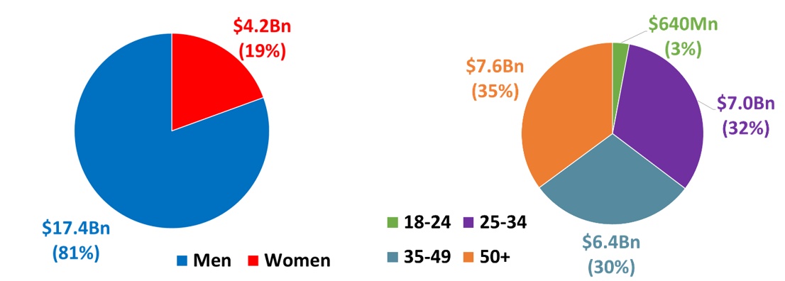 Analysis by gender reveals the average investment size for men of $23,400 is nearly twice as high as the average investment for women of $12,800.