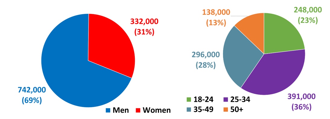 Of all crypto holders 391,000 (36%) are aged 25-34 and 248,000 (23%) are aged 18-24.