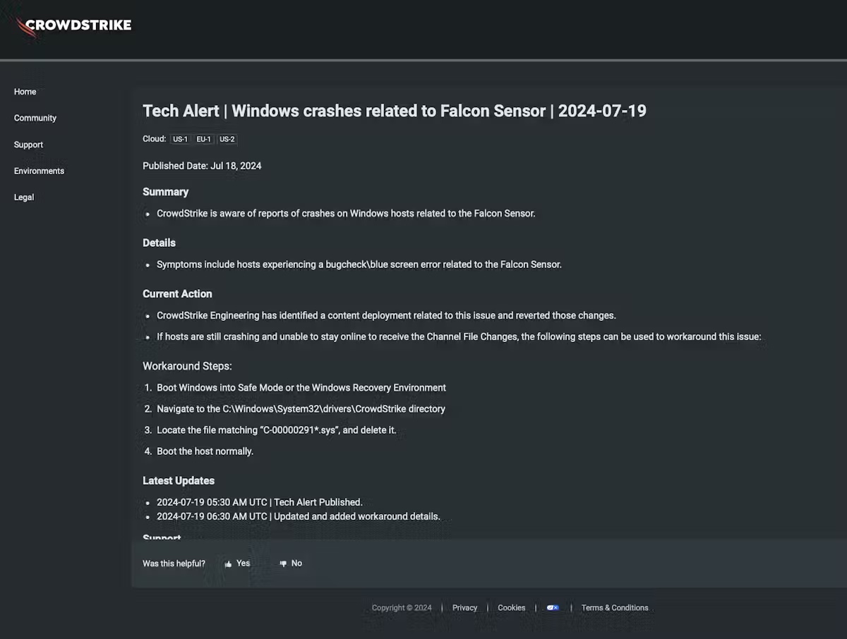 Notifications from CrowdStrike are being sent out to customers or posted to support pages that can only be accessed with a login.