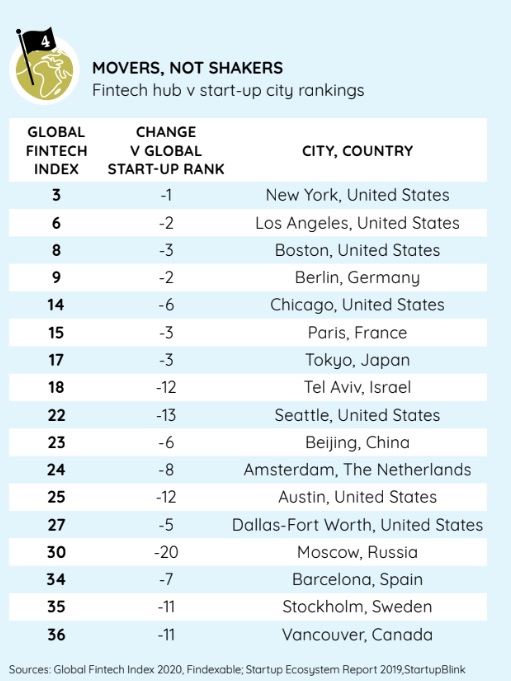 City fintech rankings compared to their overall startup rankings. Source: Global Fintech Index City Rankings 2020/Findexable