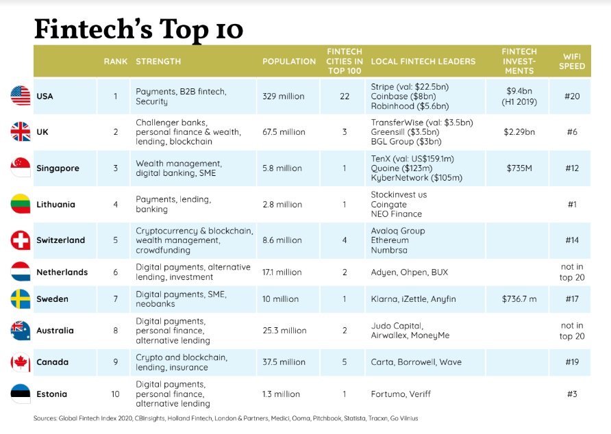 The US also tops the list for fintech countries followed by the UK and Singapore. Lithuania is a surprise fourth.