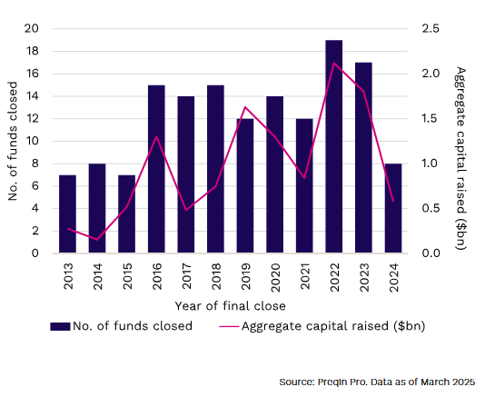 2024 was a notable down year in terms of VC fundraising with aggregate capital raises dropping to their lowest level in a decade – a sharp decline from the immediate post-COVID boom.