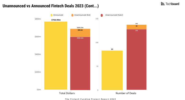 Even more astonishing is that unannounced investments represented around 60% of the number of deals done, with Techboard finding 143 fintechs with unannounced raises compared to 83 announced deals.