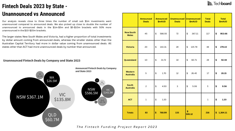 • 143 fintechs with unannounced raises collectively totalling just under $684m, supplementing the 83 announced deals raising $769m in announced deals Techboard captured for 2023, taking the total raised by Australian fintechs in 2023 to a total of $1,453.21m for the 2023 calendar year.