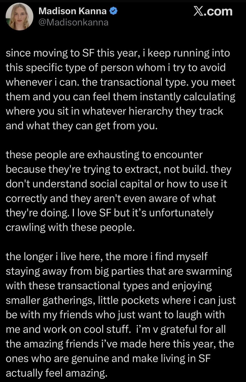 If you don’t have an account on X dot com the everything app then get one ASAP. Become a reply guy and make friends so you’re not touching down in SF and twiddling your thumbs.