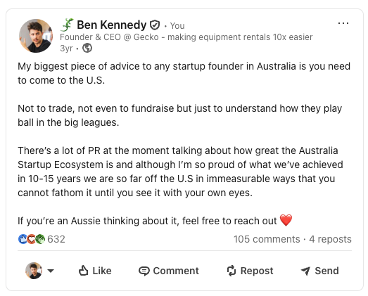 Aussies have an excellent reputation here… don’t fuck it up. Don’t be transactional. Don’t clout chase (ask someone who they raised from, how big their company is, what stage of their company they’re at, etc within the first two minutes of meeting people).