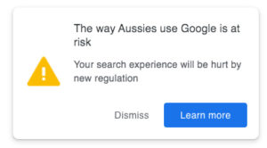Google posted a pop up note on its search page, used by 95% of Australians, saying “The way Aussies search every day on Google is at risk from new Government regulation”, with a link to the letter from Silva. A pop-up version says “your search experience will be hurt by new regulation”.