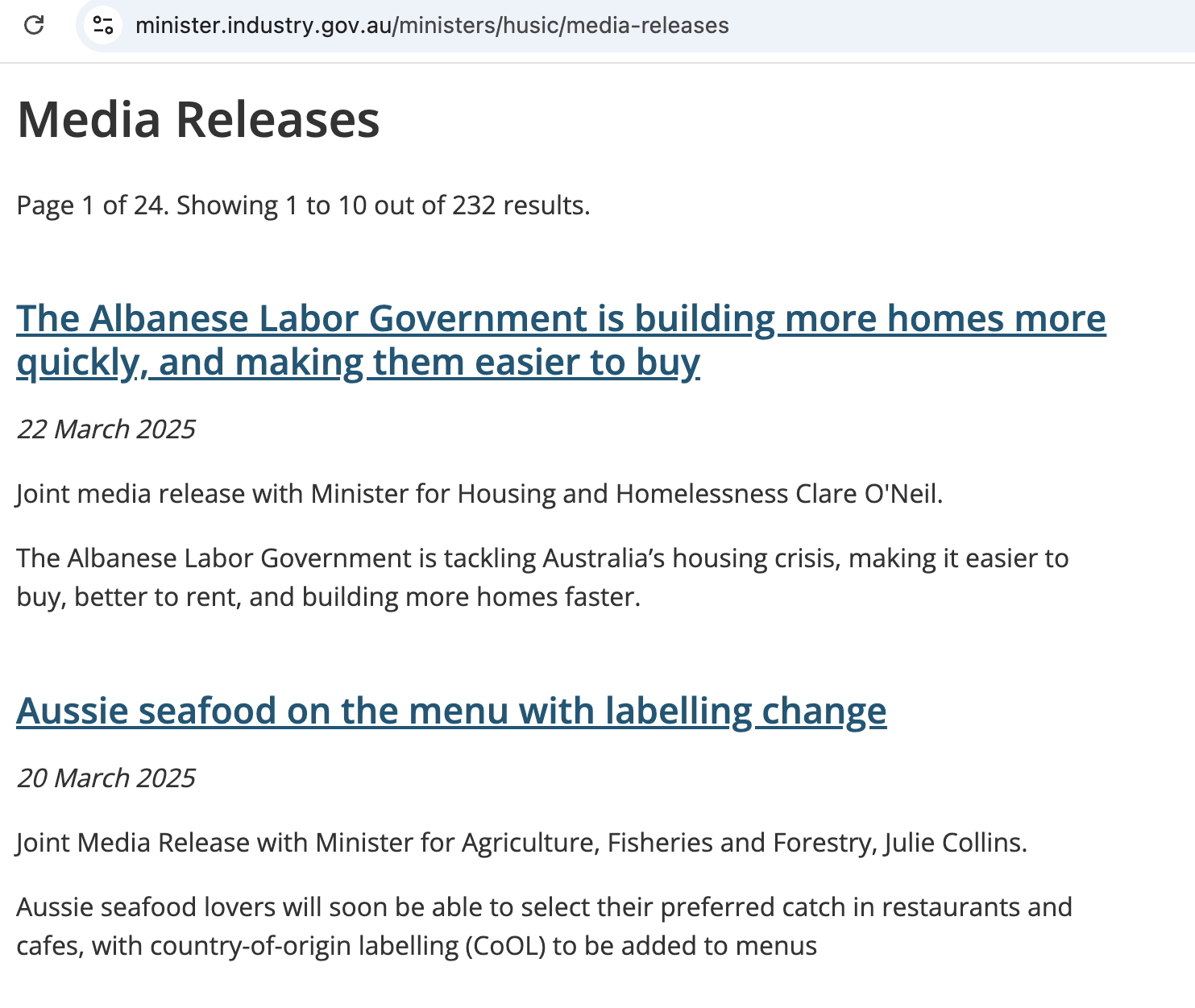 Here’s a screenshot of science and industry minister Ed Husic’s media release page at 9pm – 90 minutes after treasurer Jim Chalmers handed down the budget.