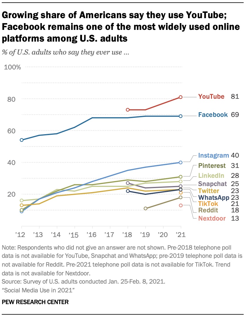 40% of adults say they ever use Instagram and about 3-in-10 report using Pinterest or LinkedIn. A quarter say they use Snapchat, which is roughly the same figure for Twitter or WhatsApp. TikTok is used by 21% of Americans, while 13% say they use the neighborhood-focused platform Nextdoor.